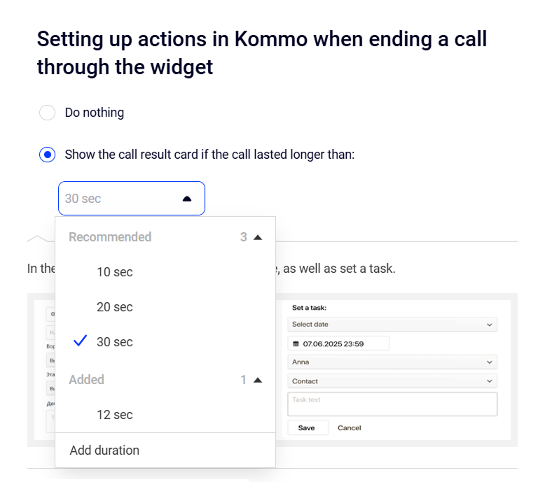 2. Click Show the call result card…. In the dropdown list, select a call duration or add your own.