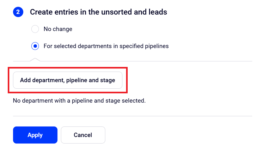 2. In the Create entries in the unsorted and leads section, choose For selected departments in specified pipelines. Then choose Add department, pipeline and stage.