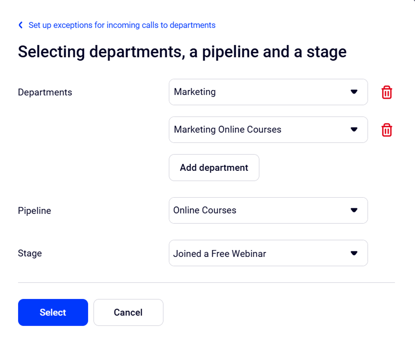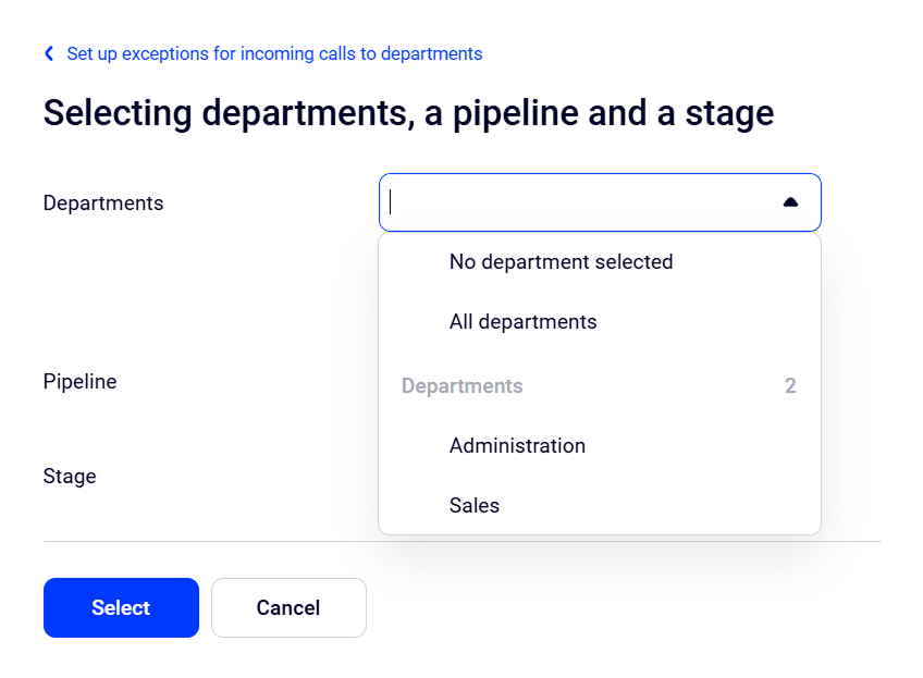 4. In the dropdown lists below, select the pipeline and stage where entries in the Incoming leads and leads will be created on calls to the selected departments.