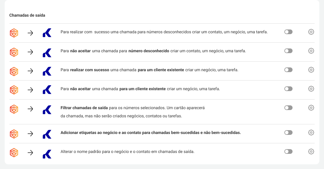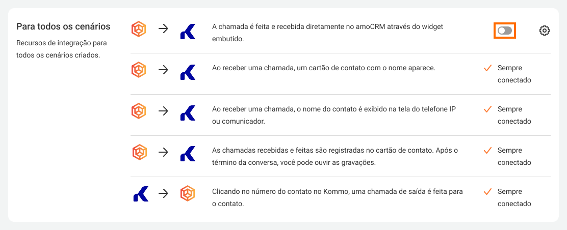 5. Set up Kommo and PBX integration scenarios (rules). Some integration scenarios are connected automatically and can’t be edited.