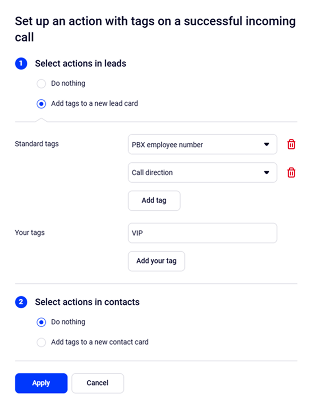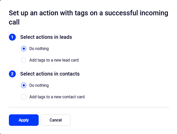 2. In the window that opens, choose what to do upon a successful incoming call: to add tags to leads or contacts or not.