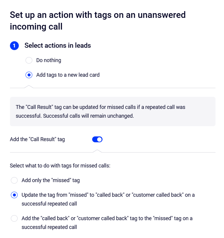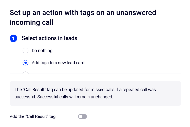 Tag rules for unanswered calls are configured the same way as for successful calls. Additionally, for missed calls, you can enable the Call Result tag, which will automatically update if a successful call to the same customer occurs later the same day. If the customer calls back, the Call Result tag will also update. To set it up, in the settings window for unanswered incoming calls, toggle the Add the “Call Result” tag switch to the right.