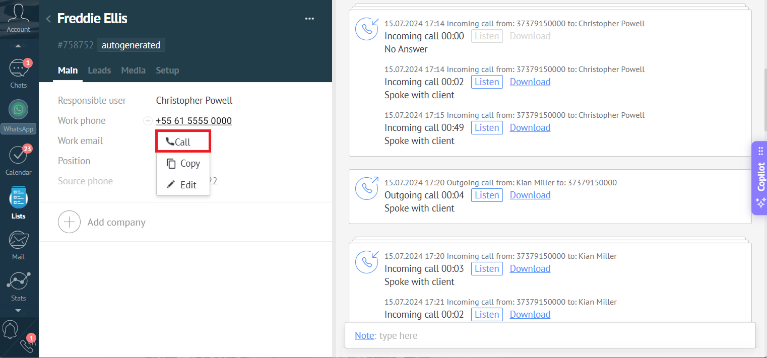 - Calling a previously saved contact: click the phone number in the customer card or in the Contacts List. Clicking the number allows you not only to copy and edit, but also call the contact directly from Kommo.
