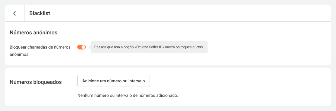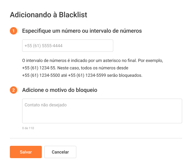Ao inserir números bloqueados, você pode usar uma máscara. Por exemplo: +49 (30) 1234-56*. Essa máscara bloqueará todos os números na faixa de +49 (30) 1234-5600 até +49 (30) 1234-5699.