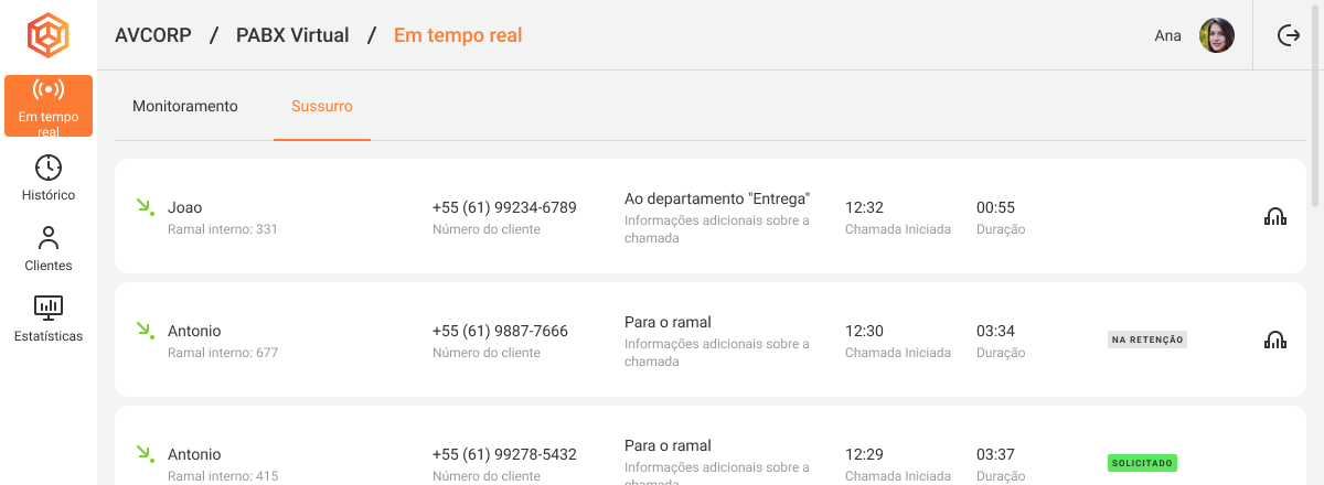 Na PABX em Nuvem você pode ver todas as chamadas ativas da empresa. Na aba Sussurro de Chamadas, são exibidos o horário de início e a duração de cada chamada. O ícone de fones de ouvido à direita mostra que você pode se conectar a esta chamada. Aqui você também verá a origem da chamada — de saída ou entrante. Para chamadas entrantes, é possível identificar de onde exatamente o cliente ligou.