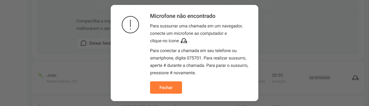 Atenção: você só pode escutar e sussurrar em uma chamada pela interface após conectar um microfone ao computador. Caso contrário, ao clicar no ícone de fones de ouvido, aparecerá a seguinte notificação: