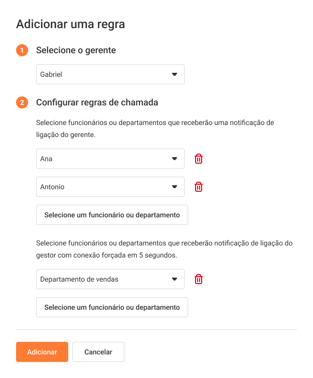 Select an employee for the enforced connection to the manager upon a call. With this setup option, the employee will first hear the “The manager is calling“ notification, and, after 5 seconds, Cloud PBX will connect them to this manager. At the same time, Cloud PBX will put their current call on hold. During these 5 seconds, the employee can warn the other person about the call from the manager and ask them to wait on the line.