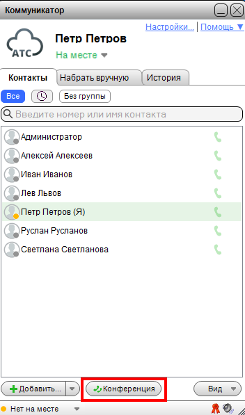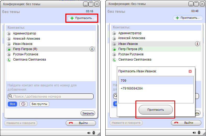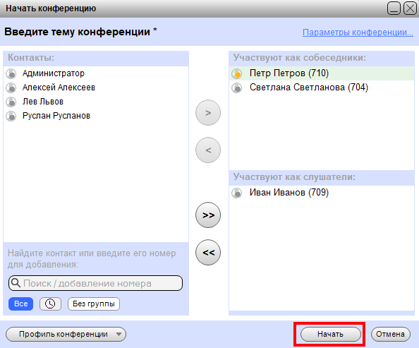 2. Selecione os colegas que participarão da conferência. Mova seus perfis da coluna da esquerda para uma das colunas à direita. Você também pode convidar clientes digitando seus números no campo no canto inferior esquerdo.