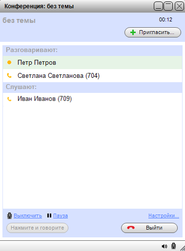 - Ouvintes. Só podem ouvir e não podem falar. Isso é conveniente, por exemplo, em treinamentos. Durante a conferência, você pode alterar o status deles e permitir que falem.