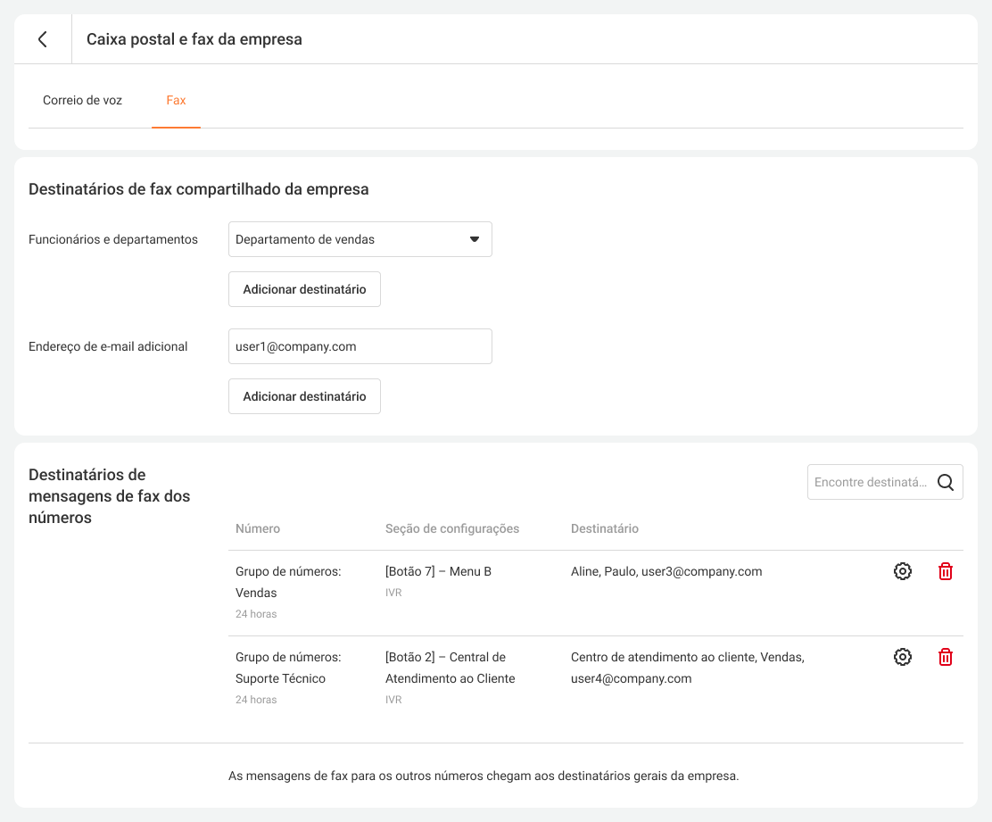 Nesta seção, além das configurações do fax compartilhado da empresa, você pode alterar os destinatários de fax de números selecionados. Para isso, clique no ícone de engrenagem ao lado do número escolhido. Na janela aberta, você pode adicionar ou remover destinatários e especificar e-mails adicionais para onde os faxes devem ser enviados.