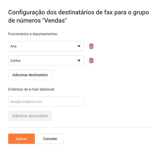 Para excluir as configurações de fax de um número, vá para a seção Destinatários de fax e clique no ícone de lixeira ao lado do número.
