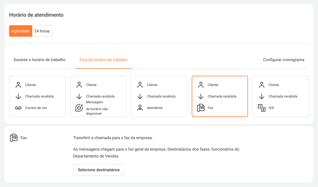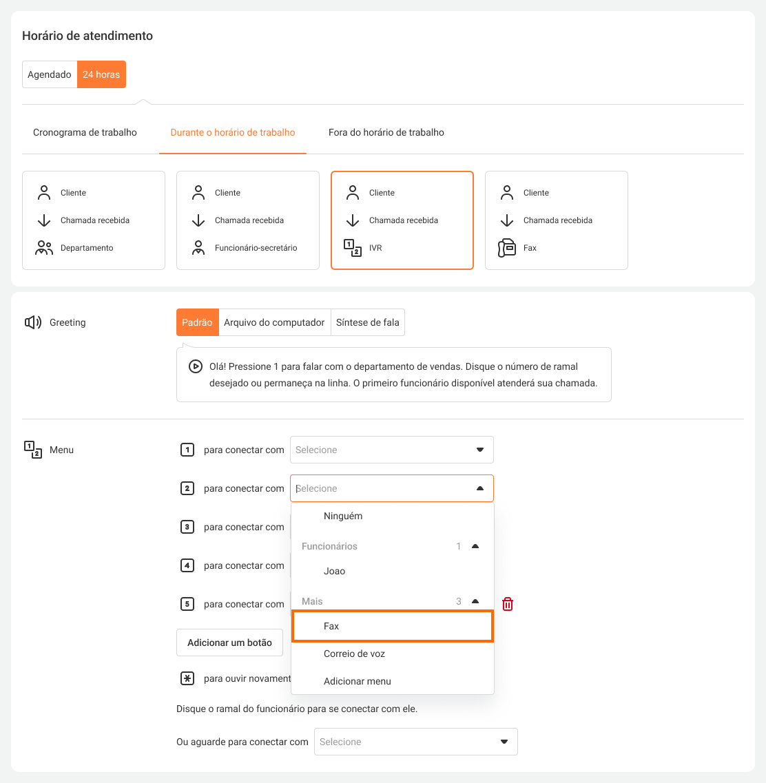 Selecione o agendamento de trabalho 24 horas e um IVR como opção de distribuição de chamadas. Conecte o fax a um dos botões do IVR.