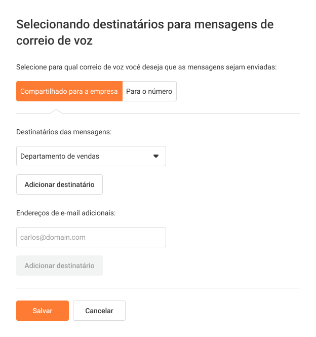- Compartilhado pela empresa: As mensagens de voz serão entregues a todos os destinatários do fax compartilhado da empresa.