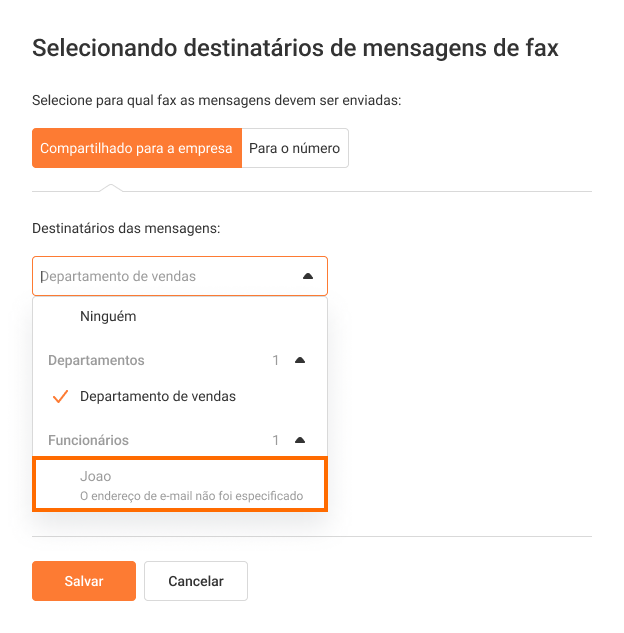 Se o perfil do funcionário não contiver um endereço de e-mail, ele não poderá ser selecionado como destinatário de fax. A Cloud PBX notificará sobre isso.
