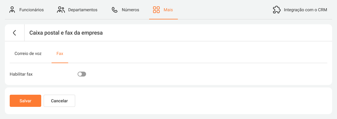 1. Vá para a seção Números. 2. Encontre os números configurados para recebimento de fax e clique no ícone de engrenagem. 3. Para cada agenda de trabalho, selecione uma nova opção de distribuição de chamadas. 4. Vá em Mais — Correio de voz e Fax da empresa — Fax. 5. Alterne a chave para Desligado e clique em Salvar.