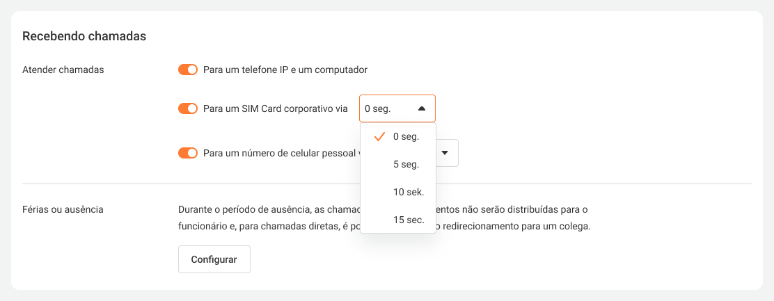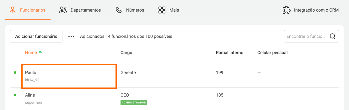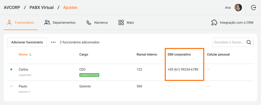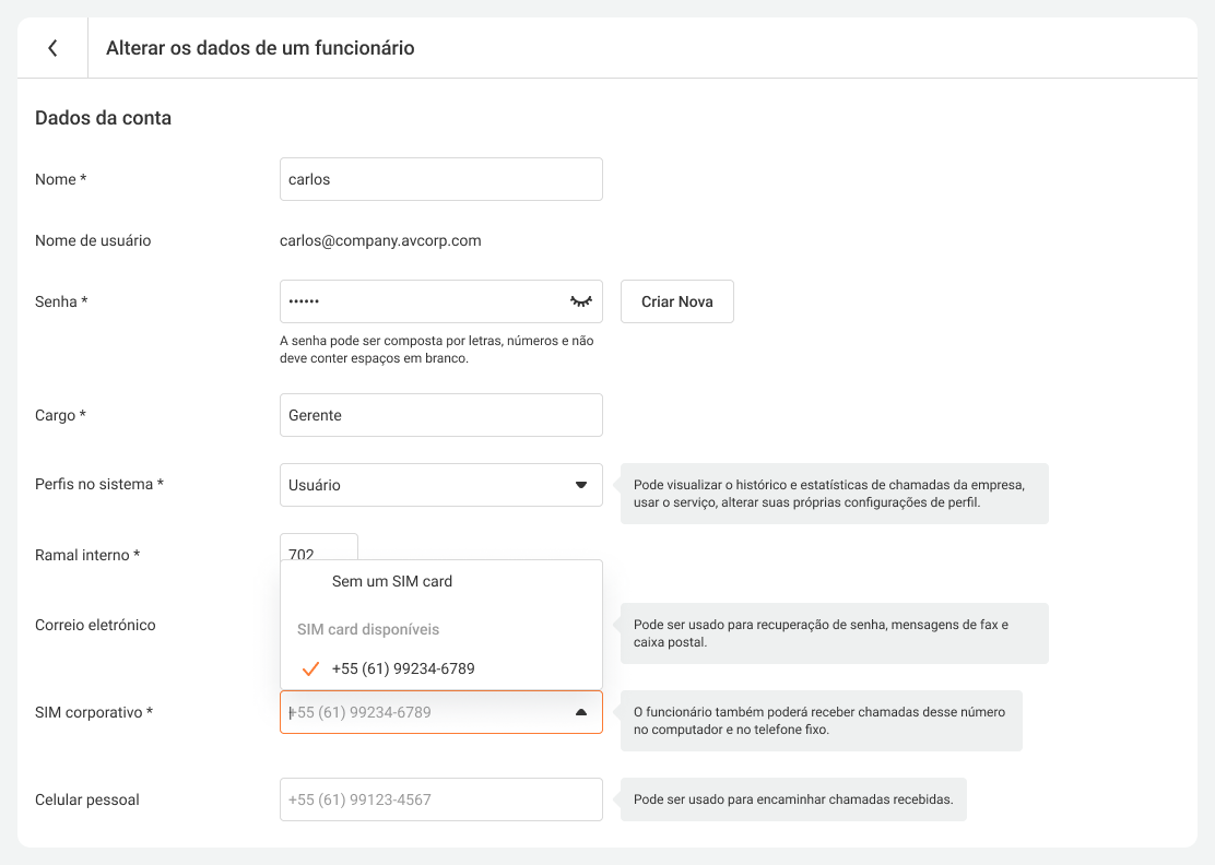 Only a user with the Administrator rights level can assign a corporate SIM card to an employee. After that, the corporate SIM card will immediately become the employee's personal number in PABX móvel.