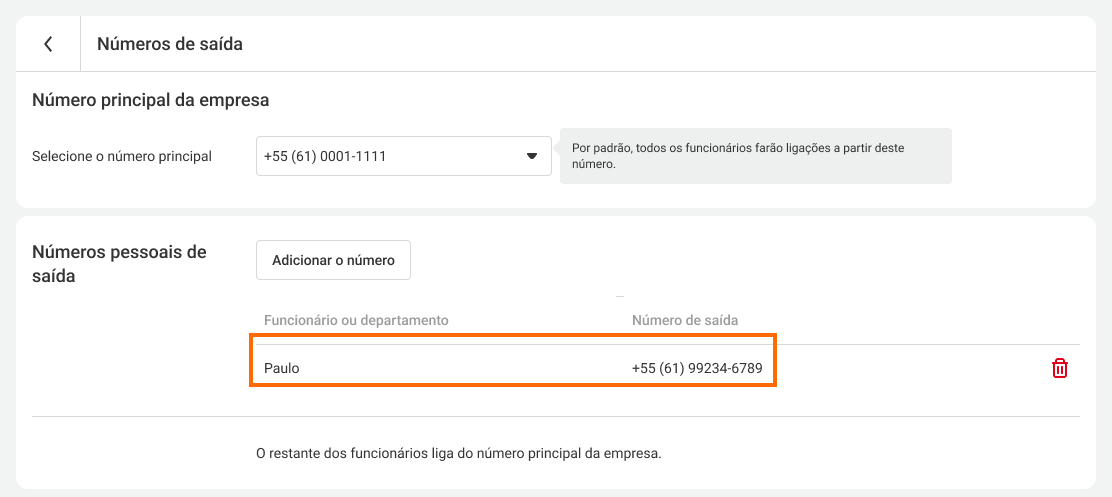 If an employee calls to a country for which a regional number has been set in PABX móvel, the customer will be shown not the employee’s personal number, but the configured regional number. See more details.If necessary, you can set up the number, from which the employee calls, another way — each outgoing call from the corporate SIM card will be displayed as a call from the shared company number. This is convenient if customers are used to calling not the manager's personal number, but the shared company phone.