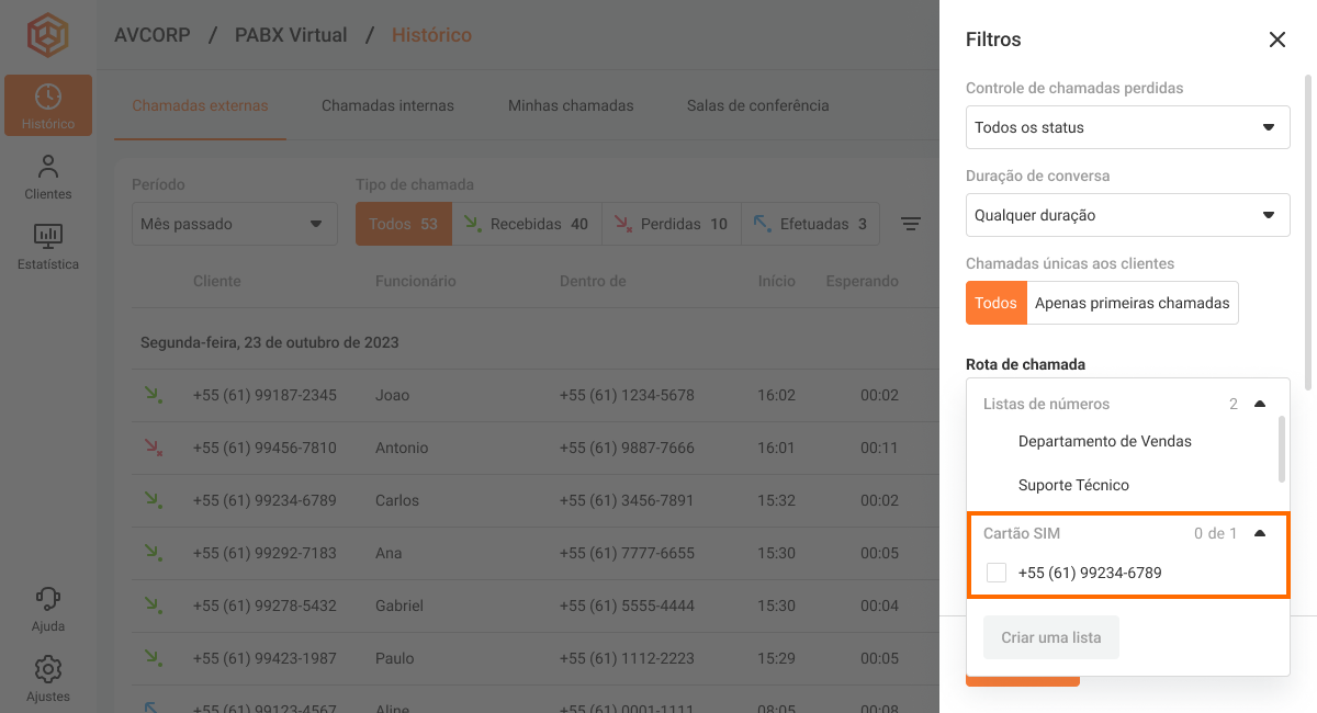 All incoming and outgoing calls from the company corporate SIM cards will be displayed in History and Statistics. Call recordings can be listened to in the PABX móvel web interface and mobile application, forwarded to colleagues and sent to your CRM using the API.