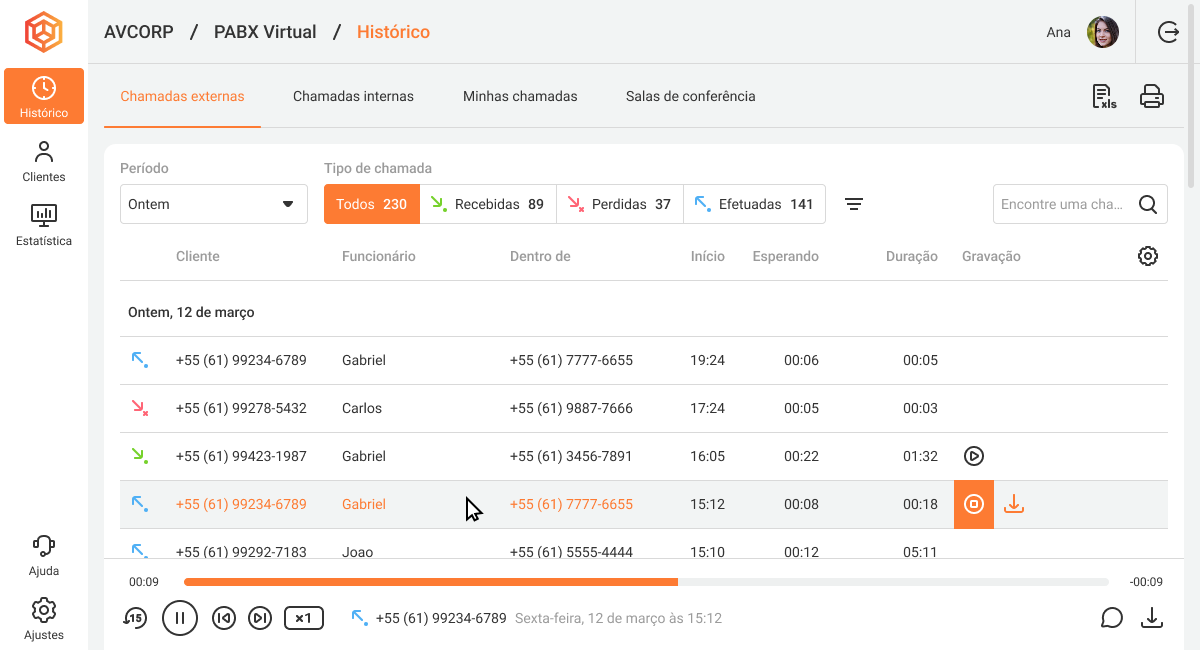 Nosso histórico de chamadas registra todas as chamadas recebidas e efetuadas de celulares, telefones SIP e softphones, incluindo chamadas entre funcionários do mesmo PBX usando números de ramal e chamadas entre funcionários de diferentes filiais.