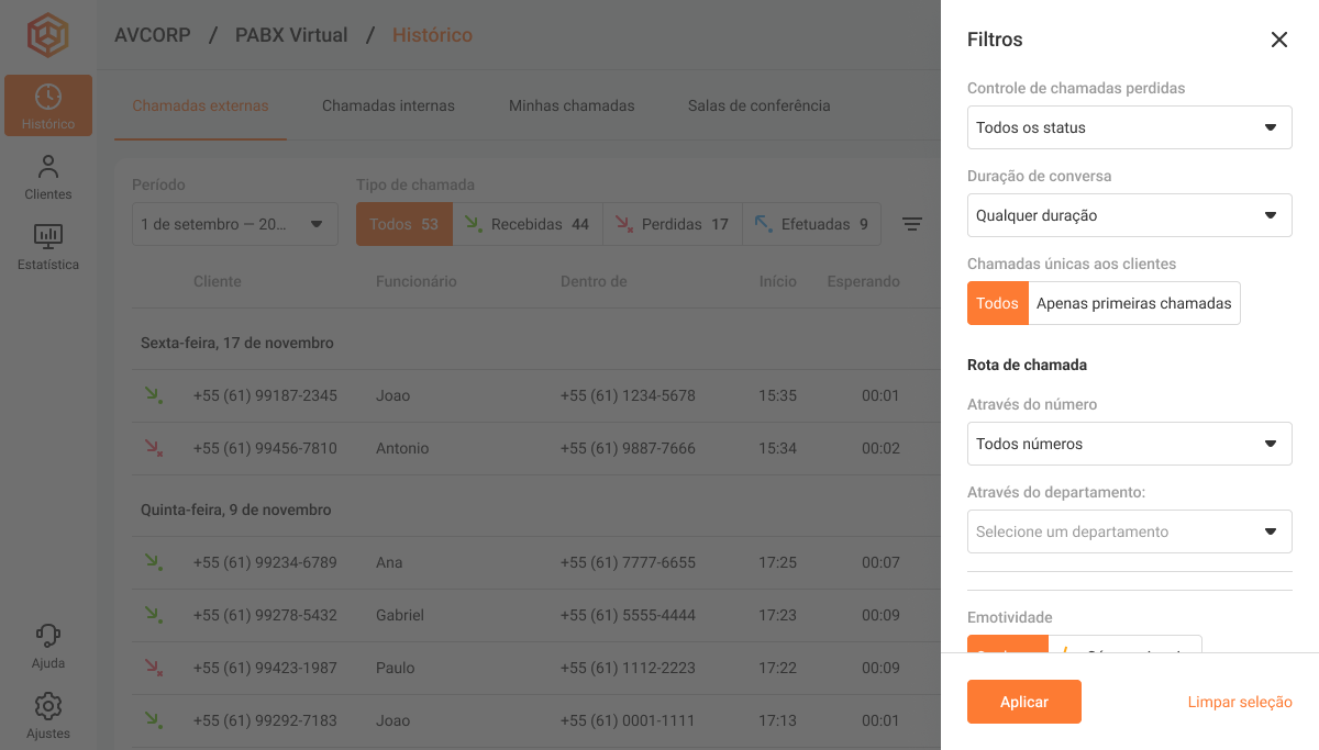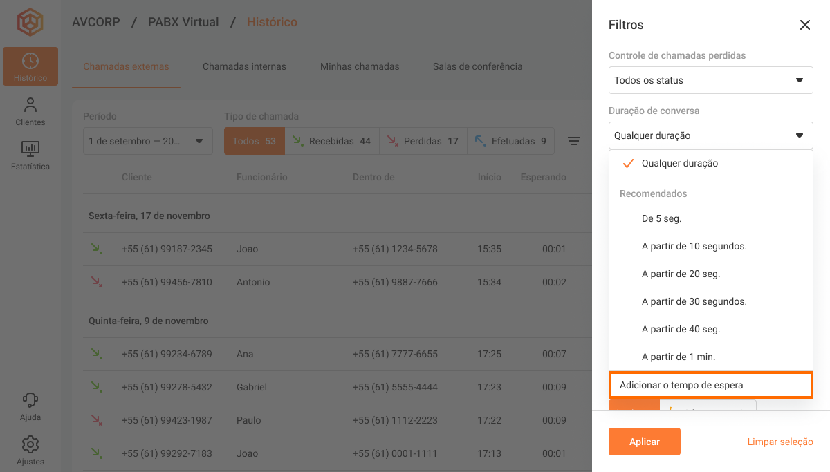 Uma barra lateral com filtros será aberta. Selecione os valores necessários e clique em Aplicar. Apenas as chamadas que corresponderem aos parâmetros especificados permanecerão na tabela.