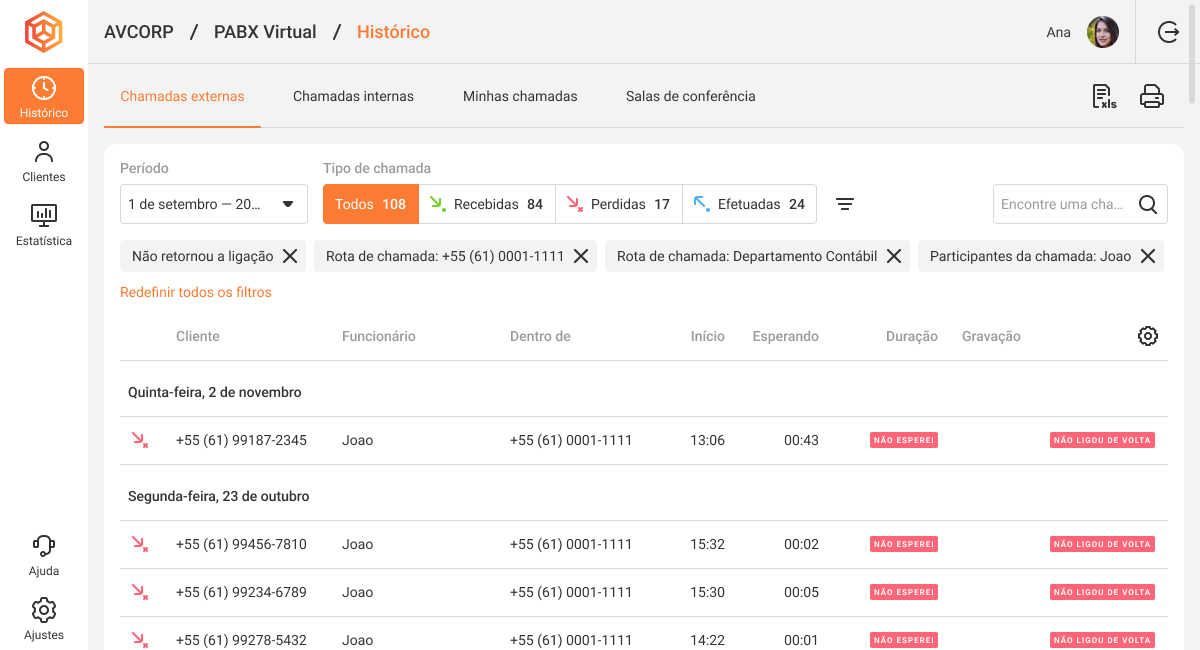 - exportar o histórico de chamadas para o Excel para gerar relatórios personalizados;