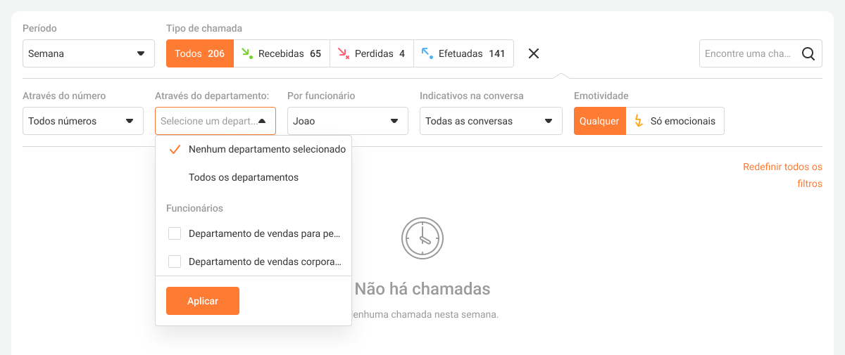 Não é possível filtrar chamadas por funcionários excluídos do PABX móvel. Se você precisar do histórico de chamadas de um funcionário excluído, não utilize o filtro por funcionários.Como Redefinir Filtros Rapidamente
