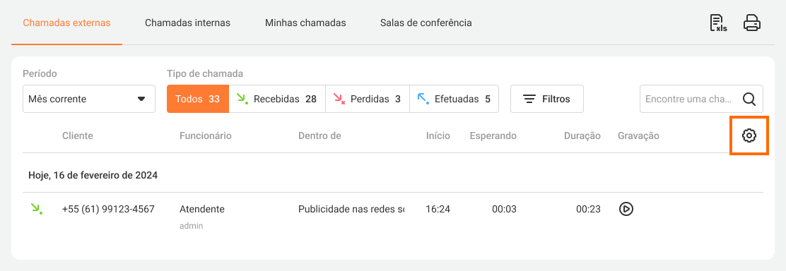 Às vezes, é importante para um gerente ver no Histórico não o funcionário que encerrou a chamada, mas quem a atendeu. Por padrão, a coluna exibe quem encerrou a chamada. Para alterar essa configuração, clique no ícone de engrenagem abaixo da barra de pesquisa.