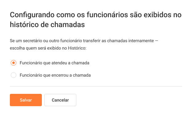 As configurações da coluna Funcionário afetam o nome exibido nas abas Chamadas externas e Chamadas internas.O PABX móvel lembra a opção de exibição de funcionário que você selecionou na coluna correspondente. Mesmo que você saia da sua conta pessoal, a configuração será mantida na próxima vez que fizer login. Apenas usuários com os papéis de Chefe de Departamento e Administrador podem configurar a coluna Funcionário. Usuários com outros níveis de acesso sempre veem, no Histórico, o funcionário que encerrou a chamada.