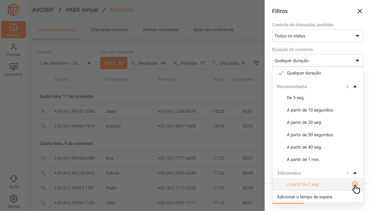 Para excluir chamadas de spam, identificar conversas muito curtas ou muito longas que exigem atenção, use o filtro Duração da chamada.