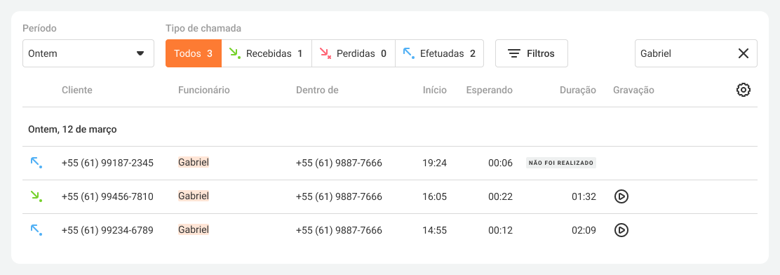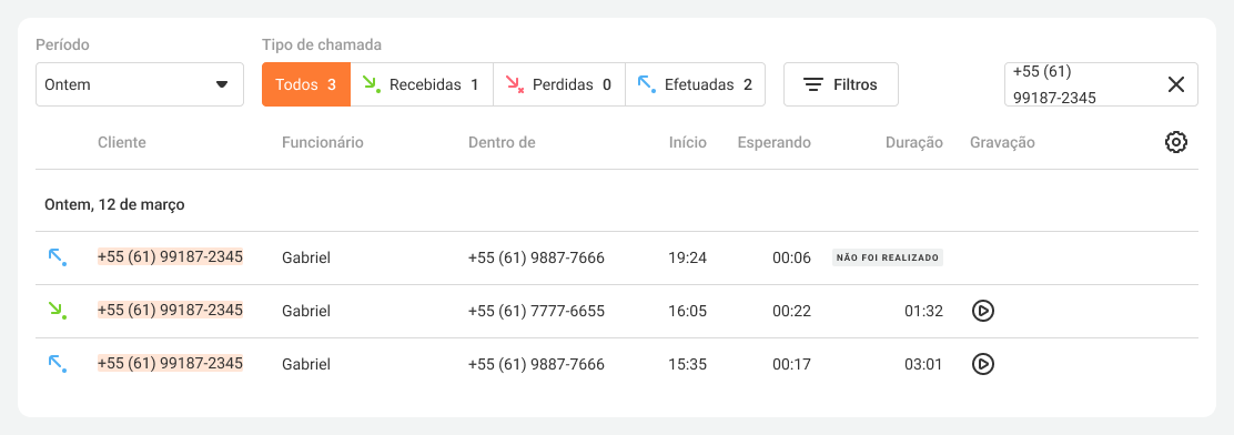 Clique no número do cliente ou digite-o no campo Procurar chamada, e você verá todas as chamadas dele para sua empresa no período selecionado.