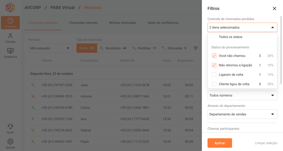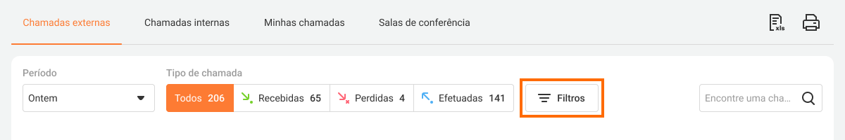 Clique no botão Filtros para classificar chamadas por números, departamentos, funcionários e status de processamento de chamadas perdidas.