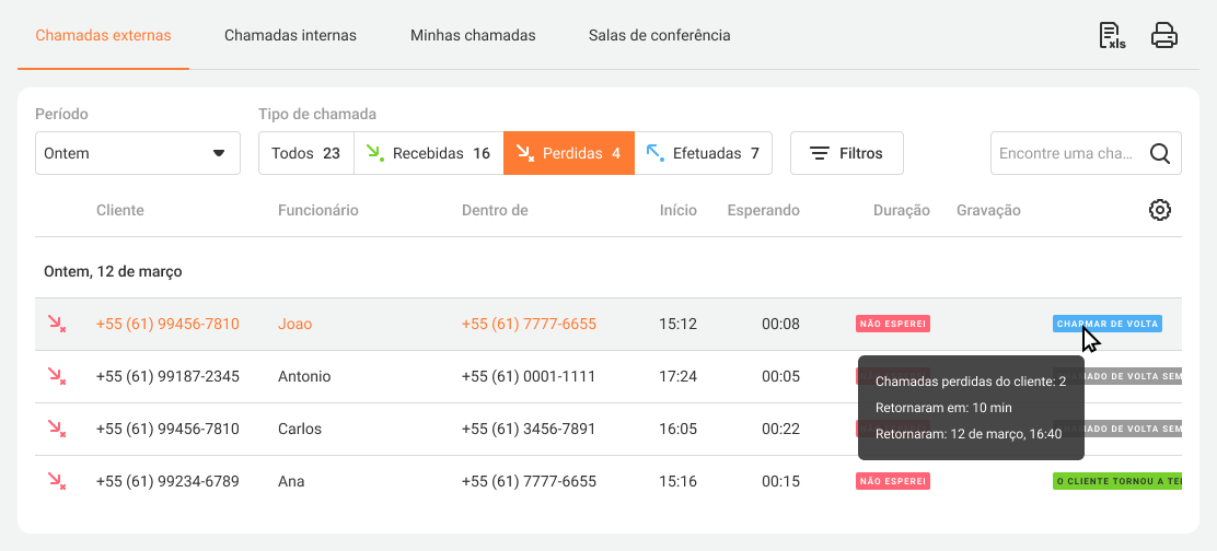 O filtro Controle de Chamadas Perdidas aparece no painel de filtros quando os tipos de chamada Todas, Recebidas ou Perdidas estão selecionados. Quando o tipo Efetuadas está selecionado, o filtro não está disponível.Com o filtro Controle de Chamadas Perdidas, você pode facilmente encontrar chamadas que os funcionários não retornaram ou não conseguiram completar.
