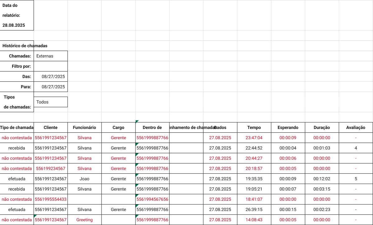 Você pode exportar o histórico de chamadas para o Excel para gerar os relatórios necessários.