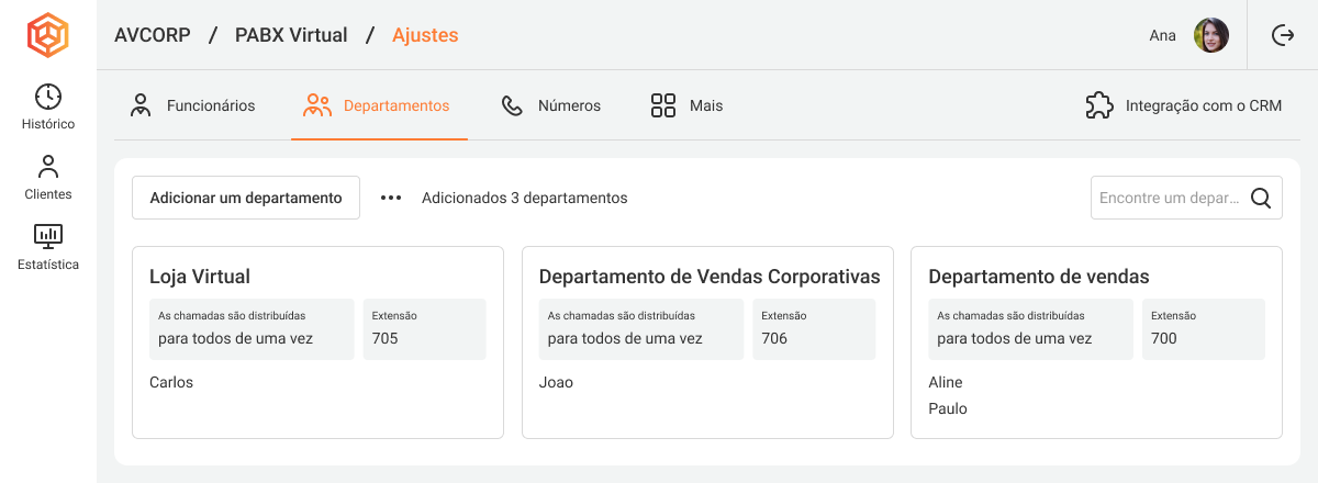 - Na aba Departamentos, crie dois departamentos. No nome de cada departamento, escreva marcas, números reais ou qualquer outra informação que precise ser mostrada ao funcionário antes de atender a chamada.