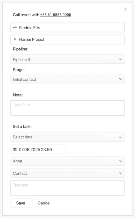 No cartão, você pode criar um contato e um lead ou selecioná-los entre os já existentes, além de atribuir uma tarefa a si mesmo ou a um colega. Vamos analisar em detalhes todos os parâmetros do cartão de resultados da chamada: