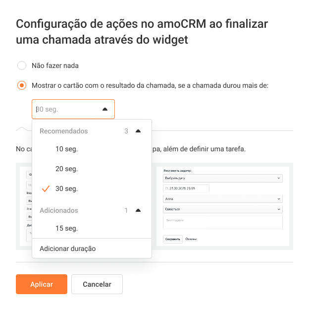 Por padrão, o cartão aparece após chamadas com duração superior a 30 segundos, para que os funcionários preencham os resultados apenas para chamadas relevantes. No entanto, se você tiver muitas chamadas curtas — por exemplo, para confirmar agendamentos de serviços — é possível alterar essa configuração.