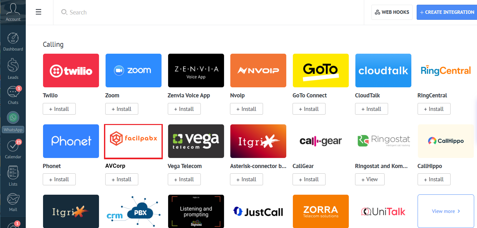 2. Na interface do Kommo, acesse Configurações — Integrações — Telefonia. Na lista de integrações disponíveis, encontre o widget do operador necessário ou digite o nome do operador no campo de busca. Clique em Instalar.