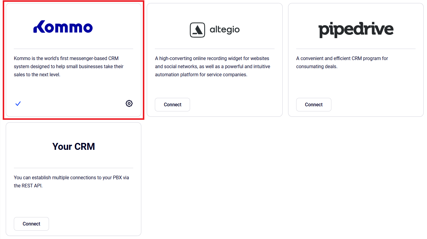 A integração só pode ser configurada por usuários com permissões de administrador em ambos os sistemas.1. No seu PABX Virtual, acesse o menu Integração com CRM. Encontre o widget do Kommo e clique nele.