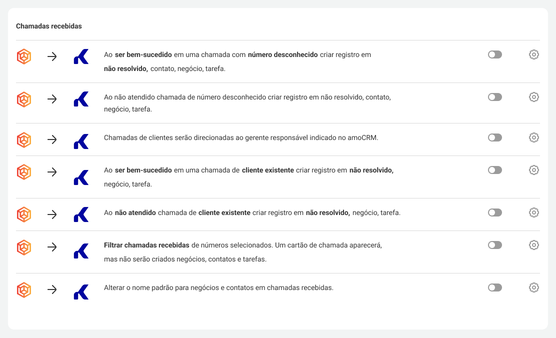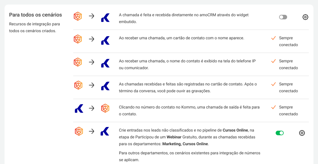 5. Configure os cenários (regras) de integração entre o Kommo e o PABX. Alguns cenários de integração são conectados automaticamente e não podem ser editados.