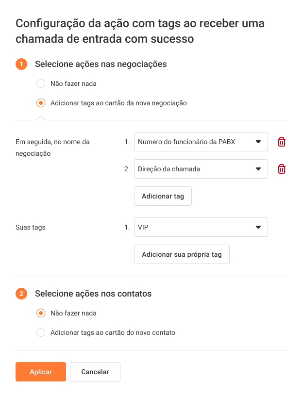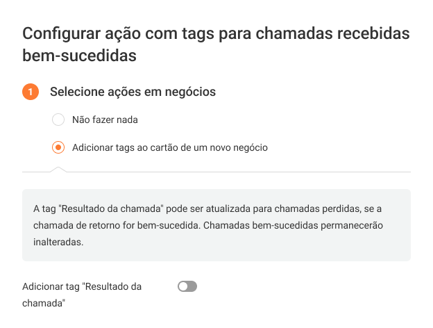 2. Na janela que se abre, escolha o que fazer em uma chamada recebida atendida: adicionar ou não tags a leads ou contatos.