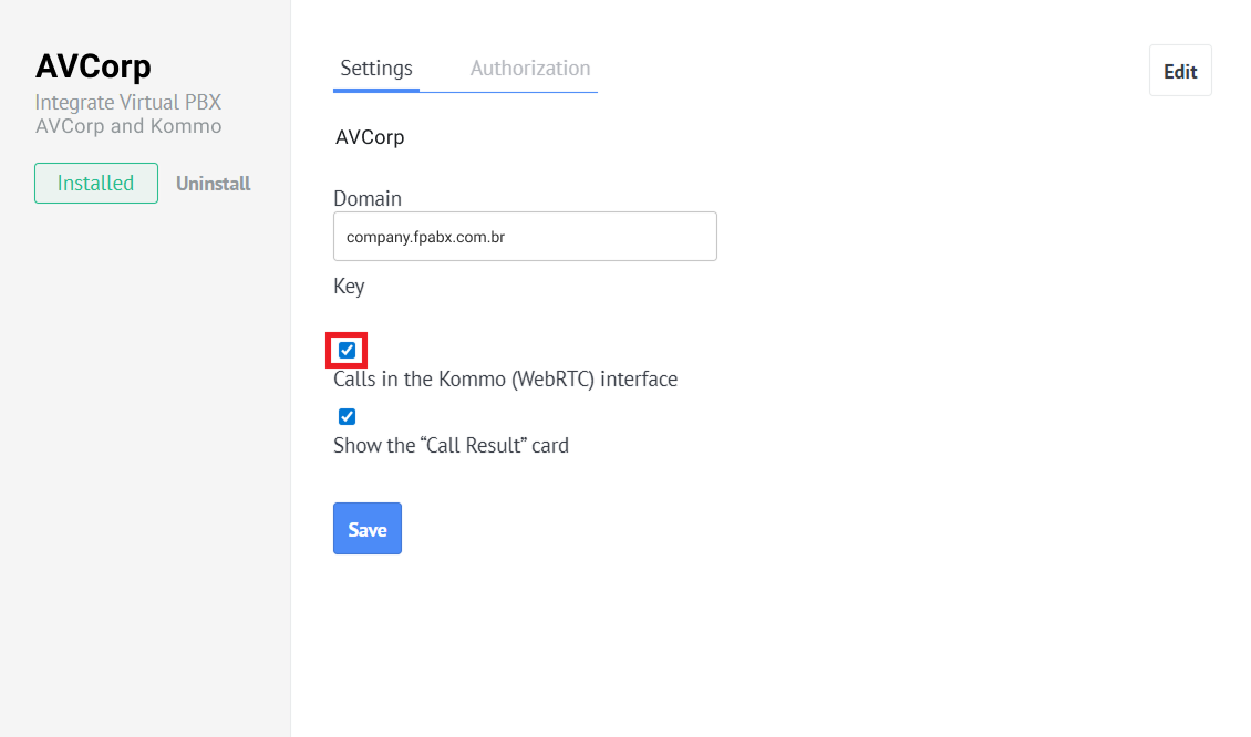 No Kommo, acesse Configurações — Integrações — Telefonia, selecione seu PABX Virtual, marque a opção Chamadas na interface do Kommo (WebRTC) e salve as configurações.