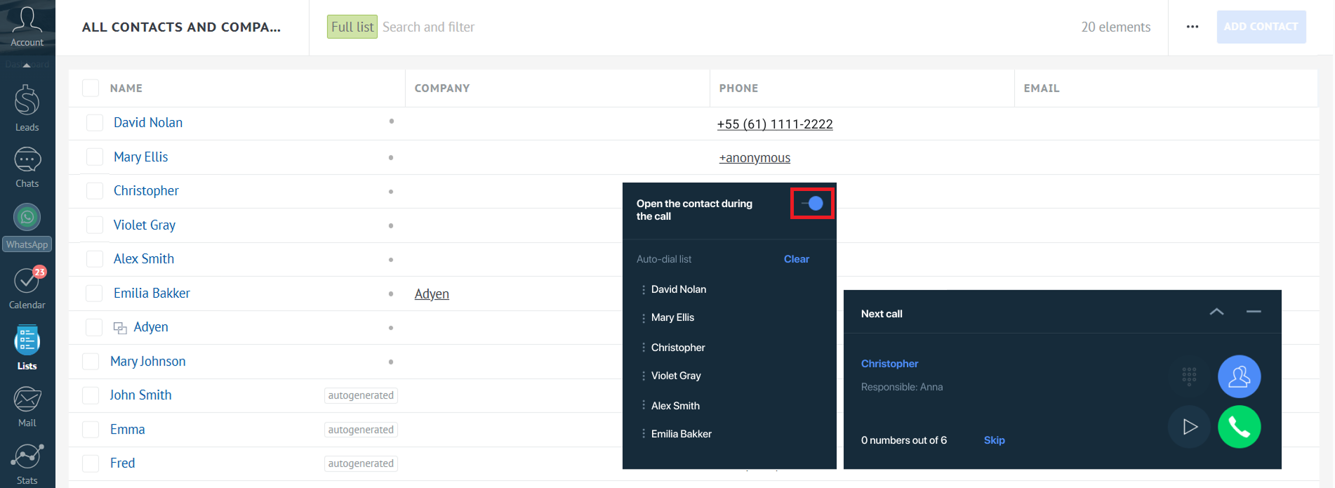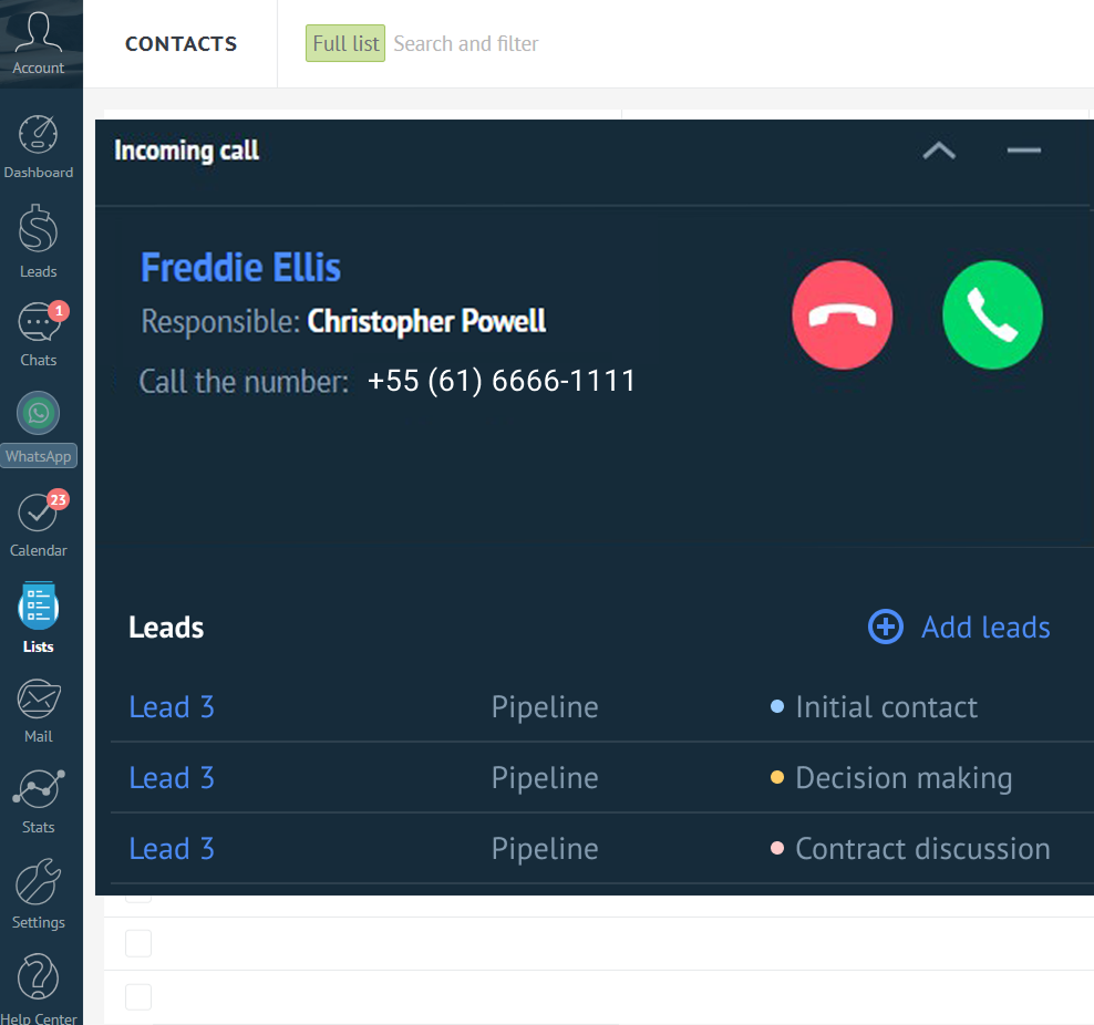 Se um gerente precisar ligar para muitos clientes, é possível economizar tempo criando uma lista de discagem automática de contatos no Kommo e iniciando-a pelo widget.