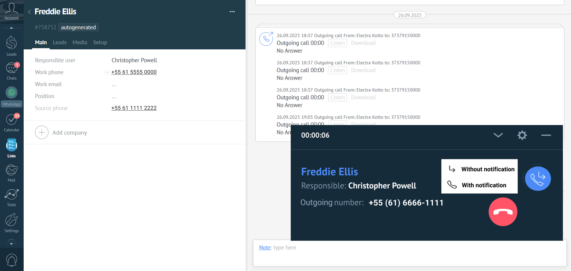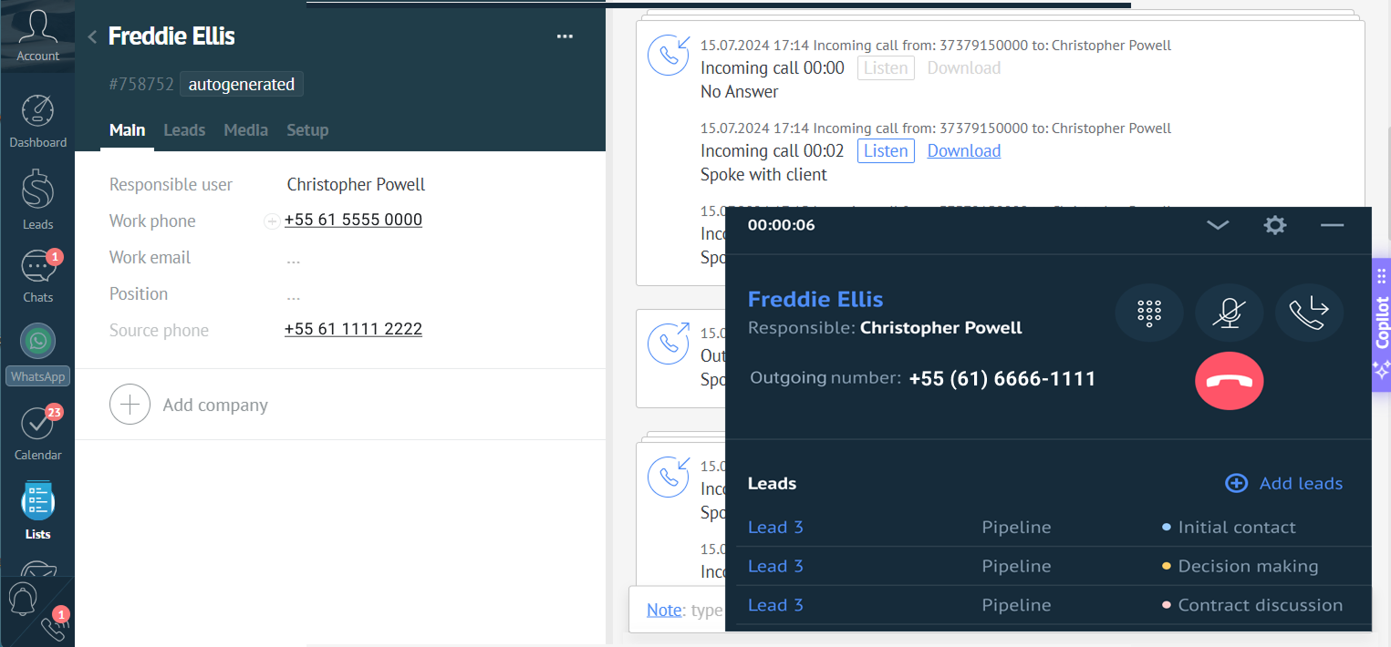 - Ligação para um contato já salvo: clique no número de telefone no cartão do cliente ou na Lista de contatos. Ao clicar no número, você pode não apenas copiar ou editar, mas também ligar diretamente para o contato a partir do Kommo.