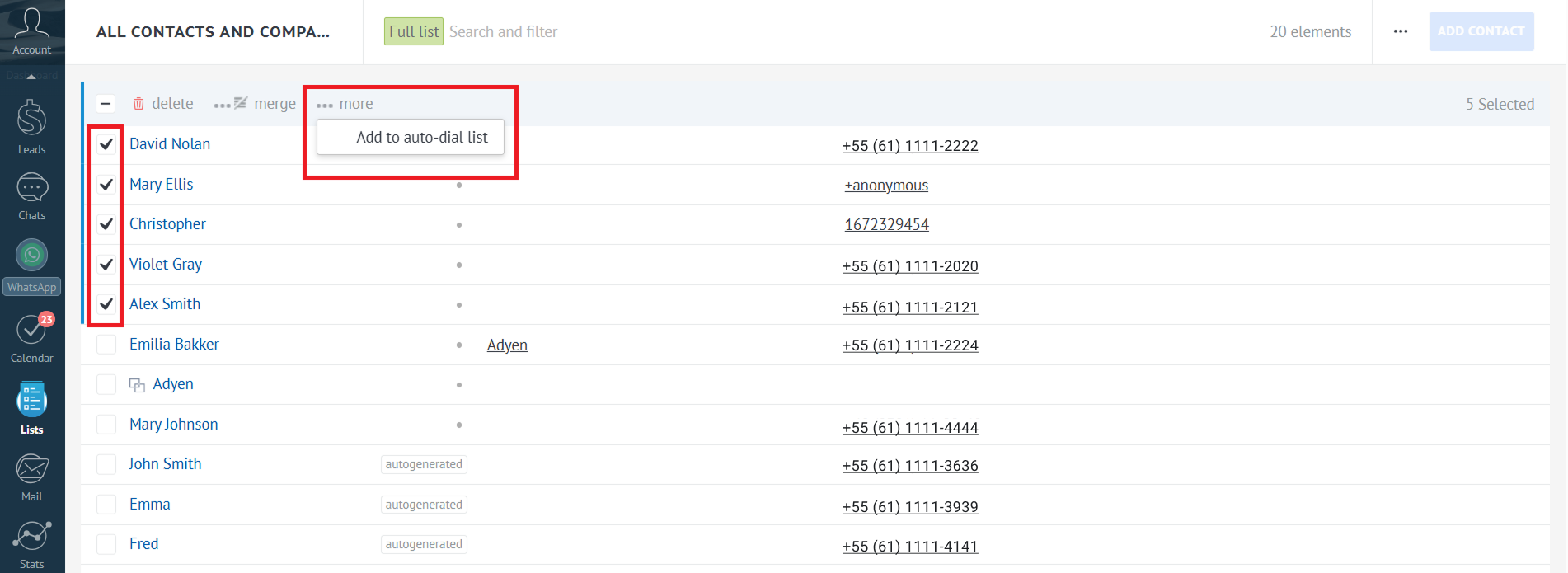 Para criar uma lista de chamadas, selecione vários nomes na lista de contatos, clique em Mais e depois em Adicionar à lista de discagem automática.