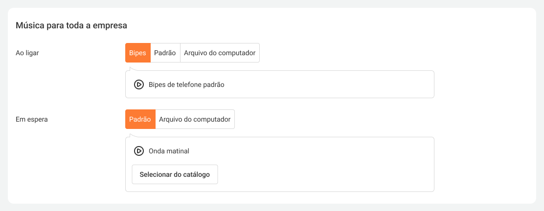 No catálogo de melodias padrão, você pode escolher a música que será reproduzida ao ligar para os números e departamentos da empresa. A Cloud PBX oferece atualmente 7 melodias padrão.