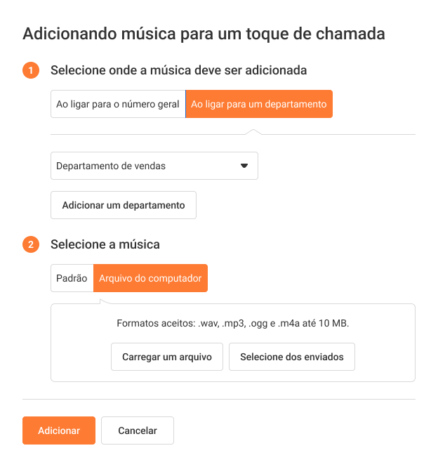 Você pode adicionar uma melodia única para cada departamento ou número. Clique em Adicionar música na seção Música para departamentos e números.