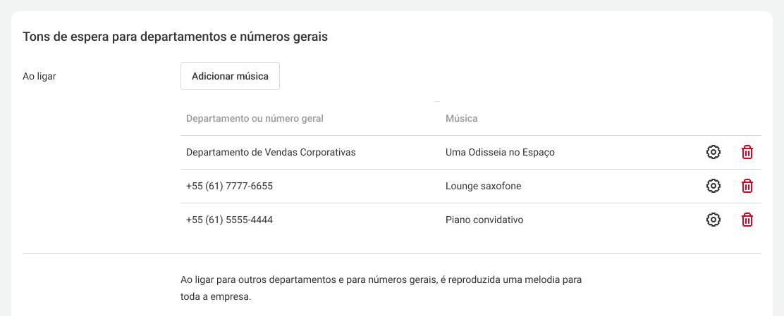 Para alterar a música de um departamento, clique no ícone de engrenagem localizado à direita do nome do departamento e da música. Para remover a configuração de música, clique no ícone de lixeira.