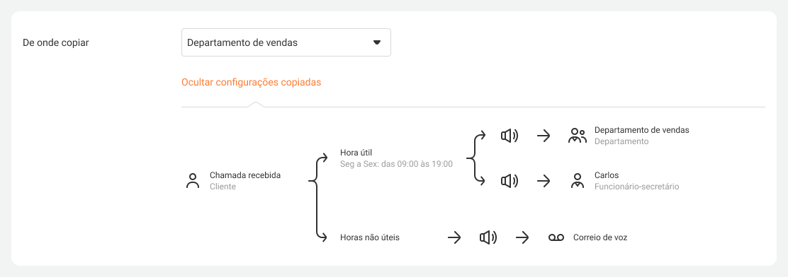 Below you will see and be able to check the settings you want to copy to another number: the call reception scheme, work schedule or greeting settings.