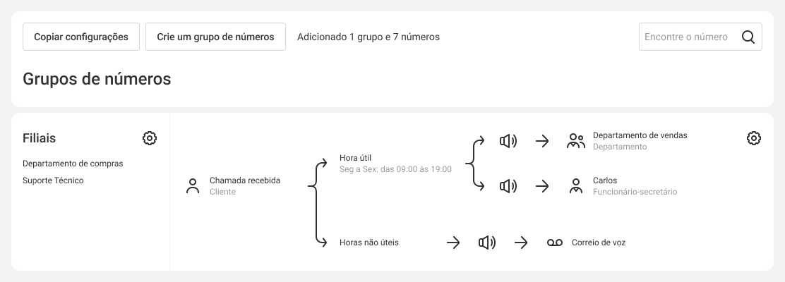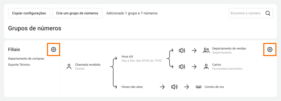 • if you need to change the rules for receiving calls, the schedule, the greeting in the number group, click on the gear icon to the right of the call reception scheme.