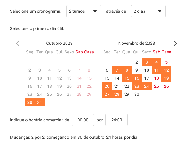 - Shifts, for example, 2 on 2 off – with this schedule starting from the selected date, two working days, and two days off alternate.